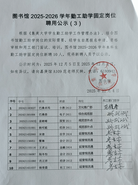 图书馆2025-2026学年勤工助学固定岗位聘用公示(3)